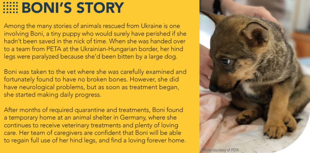 We don’t often hear about it on the news, but animal rescue and welfare organizations like BDRR, NFA, PETA and more have been working tirelessly to save dogs and cats from the bombed streets of Ukraine. Teams of courageous volunteers from these organizations brave dangerous conditions so that frightened, abandoned and needy animals can have another chance at life, someplace where they’ll be safe, loved and cared for.