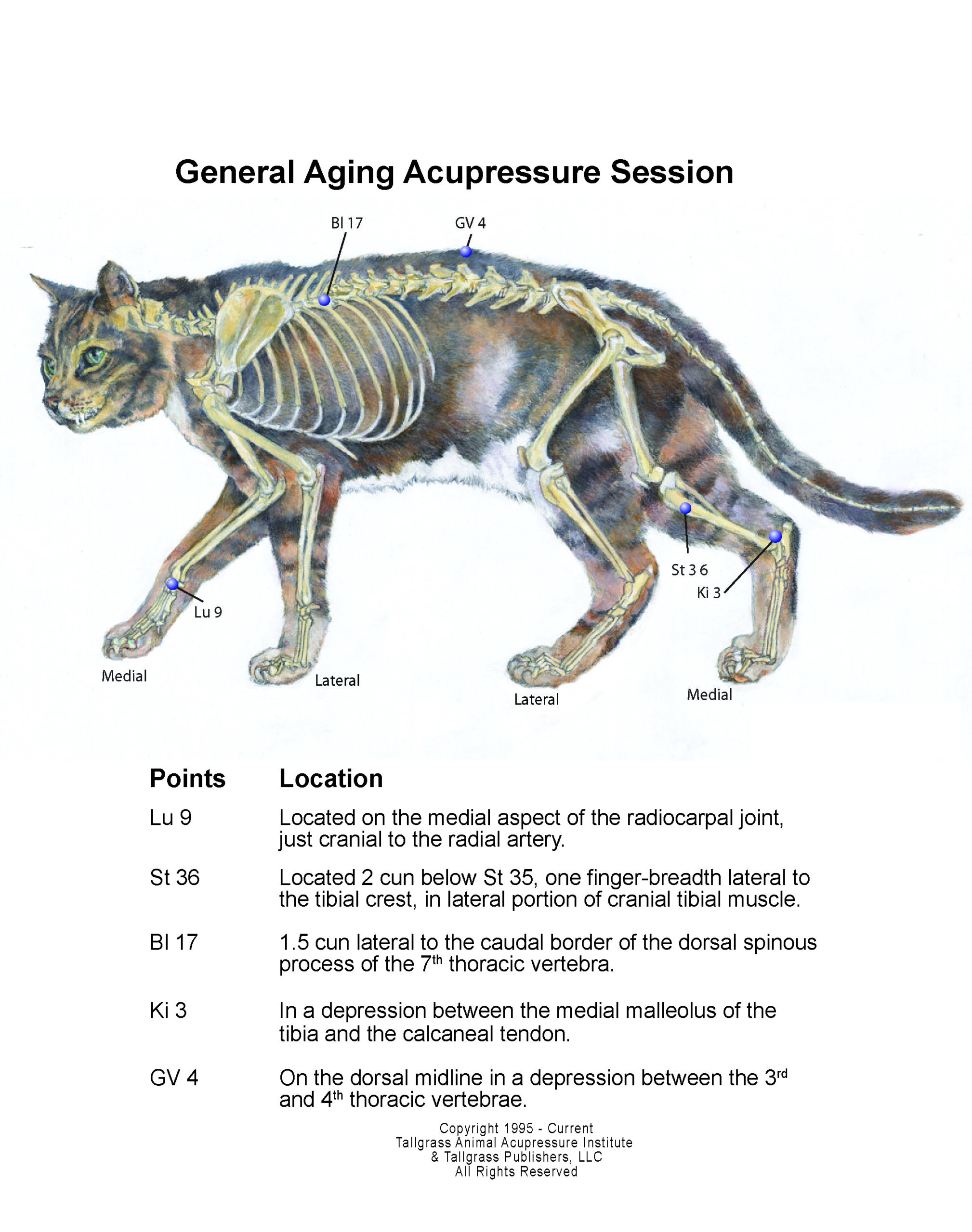 To postpone some of the inevitable effects of aging, and possibly even extend your cat’s life, you can also stimulate the acupoints shown on the “General Aging Acupressure Session” chart (above). The selected acupoints are intended to support respiratory function, digestion, and circulation of blood and chi.