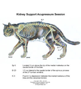 Because cats are so prone to kidney disease, an acupressure session that addresses kidney function specifically can be beneficial. Specific acupoints are known to help support the Kidney organ system, and can be used in healthy cats as well as those with kidney issues. When you stimulate the acupoints shown in the chart below, you will actually help enhance the harmonious flow of chi (life force energy) and blood within both the kidney itself, and the cat’s entire body (see sidebar for instructions on stimulating acupoints).