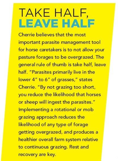 Another advantage of cross-grazing horses and sheep is improved parasite control (see sidebar at right). Parasites are host-specific, and most parasites that impact horses do not mature in sheep or other livestock, weakening the parasite’s life cycle. Cherrie, however, cautions that such benefits are sometimes overstated. “Even when cross-grazing, most horse owners do not have the available land to allow pastures sufficient rest between same-species grazing periods to effectively break the parasite life cycle,” she says. “Cross-grazing still helps from a parasite dilution perspective, but it is not a cure-all.”