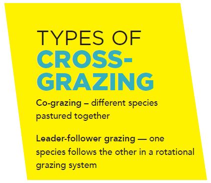Cross-grazing is generally defined as a grazing management practice in which different species of animals share the same pasture, whether together or separately, within the same growing season. Co-grazing, in which different species are pastured together, and leader-follower grazing, in which one species follows the other in a rotational grazing system, are two types of cross-grazing practices.
