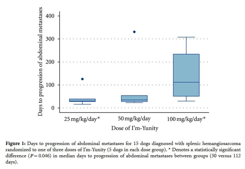 The median time to development or progression of abdominal metastases was significantly delayed in dogs receiving 100 mg/kg/day I’m-Yunity (112 days; range 30 to 308 days) compared to dogs receiving 25 mg/kg/day (30 days; range 16 to 126 days; P = 0.046). Dogs receiving 50 mg/kg/day I’m-Yunity had median 35 days to progression of metastases (range 23 to 331 days), which was not significantly different than the 25 or 100 mg/kg/day groups (Figure 1).