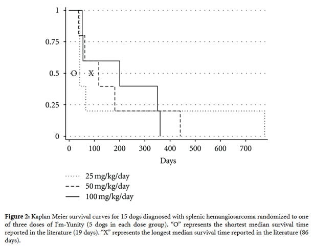 The Kaplan Meier survival curves for the three dose groups are presented in Figure 2. While there was no statistically significant difference in the survival curves amongst the 3 dose groups, the two highest dose groups had median survival times longer than the longest median survival time reported in the literature to date, which is 86 days, as compared to 117 days in dogs receiving 50 mg/kg/day I’m-Yunity and 199 days in dogs receiving 100 mg/kg/day.