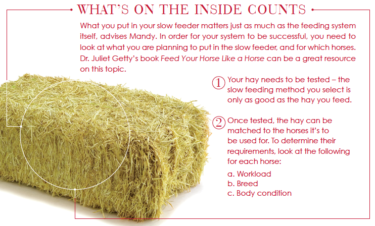 While the major benefit of slow feeding is proper digestion, this system has many other benefits as well, ranging from emotional to physical. “Judy Hoffman from Hoffman’s Horse Minerals had a favorite horse she was not able to ride anymore,” says Mandy. “His coughing (CPOD) had become severe. I talked to her and sent her home with a slow feeder. Within a week, we received a lovely message that she had noticed the cough changing. By the second week, she was riding him with no cough at all. My key to knowing this slow feeding system was going to work for this horse was that he never coughed when on grass, but went downhill as soon as he had to be on dry feed.”