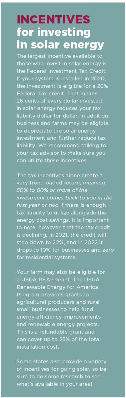 As your solar system generates electricity every day, it replaces some or most of the kWhs you would normally be buying from the utility. If your typical farm usage is 10,000 kWhs a month, your solar system may produce enough to reduce that to 500 kWhs, so now you are only purchasing 500 kWhs from the utility with the rest coming from the sun and your solar array. Most farms can recoup their solar energy investment in less than ten years with a significant portion of the investment returning in the first year or two with current incentives (see sidebar at right).