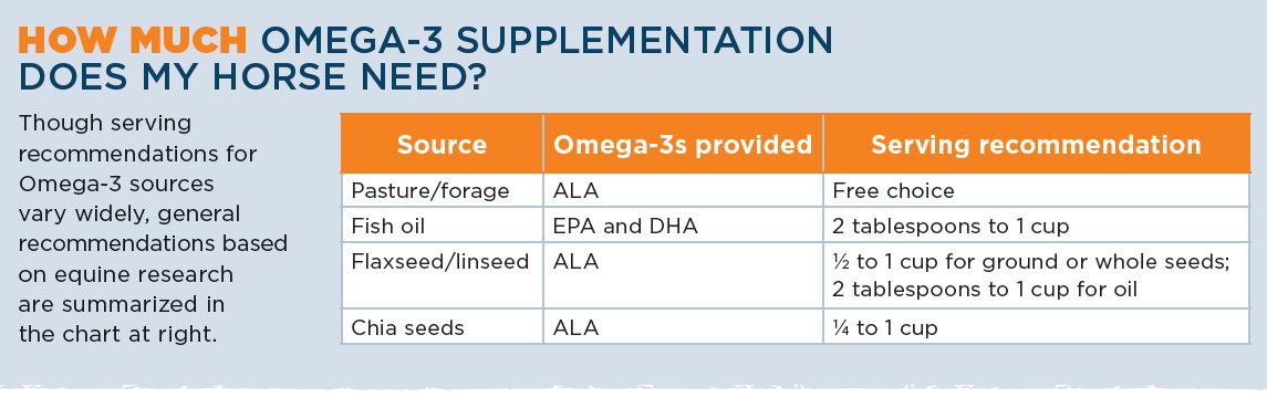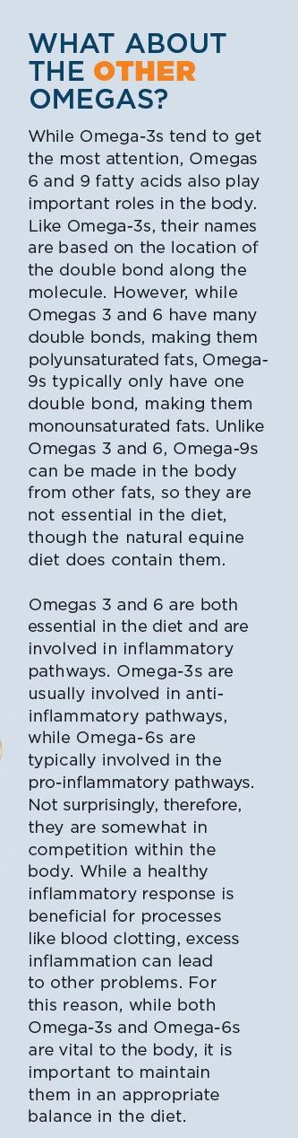 Overall, horses are designed to have a diet high in Omega-3s, as provided by fresh forage. Because not all horses are fed fresh forage, and some have additional needs for Omega-3s, supplementation with other sources can be beneficial.