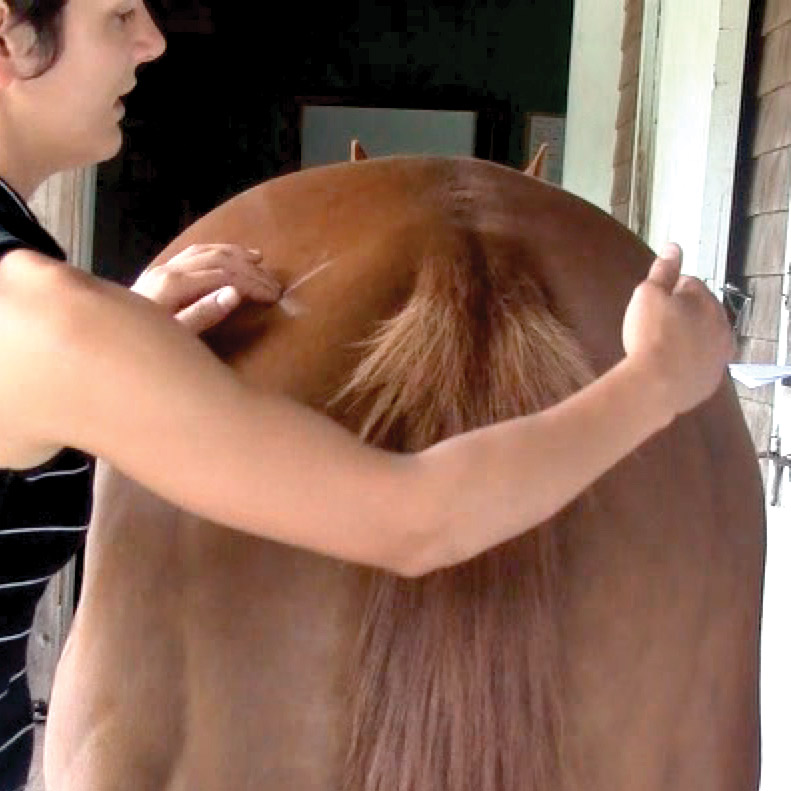 This stretch is a crowd pleaser. Use caution – it requires you to stand directly behind your horse. If you have an unpredictable horse, stand off to one side. Find the point approximately 4” on either side of the base of your horse’s tail. Then use your fingers and scratch. Your horse should raise his back. If you aren’t getting a reaction, apply more pressure. Once he elevates his back, let him come back to normal and repeat the stretch two more times. This stretch is great before and after riding to help prepare the horse’s back muscles for the tasks ahead.