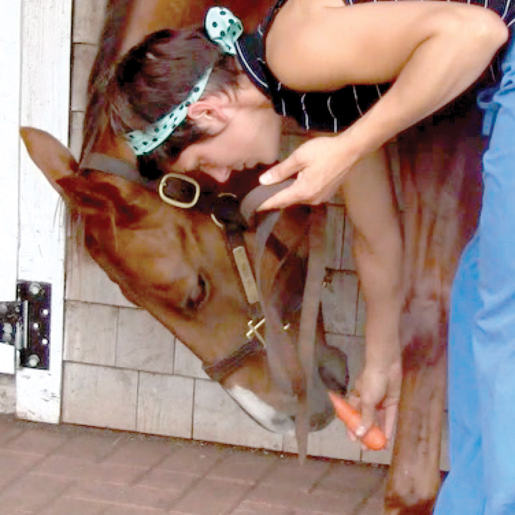 b. Knees: Hold the carrot between your horse’s knees. This stretches the topline from the poll to the loin.