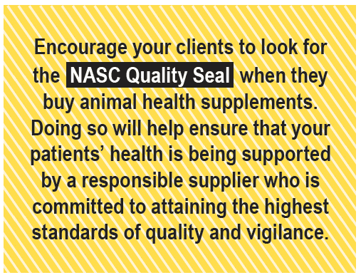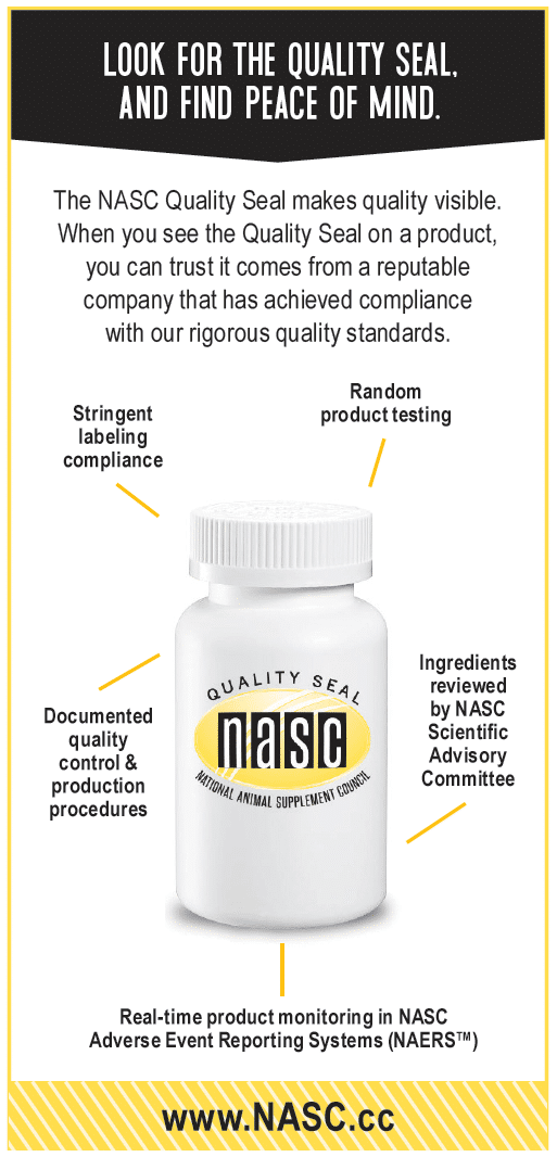 The National Animal Supplement Council (NASC) is improving and standardizing the animal supplement industry by awarding their Quality Seal to companies that meet their rigorous standards, and paving the way to better health solutions for your clients.