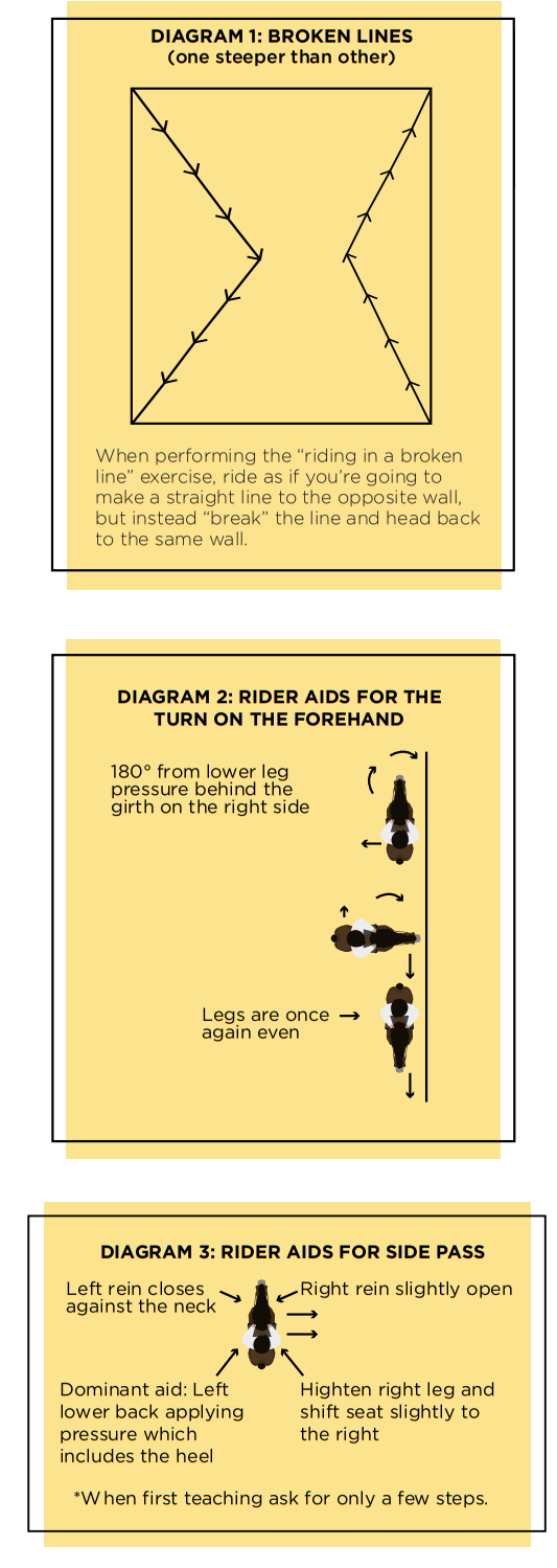 Teach the horse to move her shoulders by “riding a broken line” (see diagram). Beginning in a corner of the arena, apply gentle pressure to the horse’s neck to cue the shoulders away from the wall. It helps to slightly open the inside rein toward the desired direction. When the horse has moved away from the wall and toward the center of the arena, put both reins back toward the next corner. This exercise gives your horse a chance to practice responding to the framing of the rein aids.