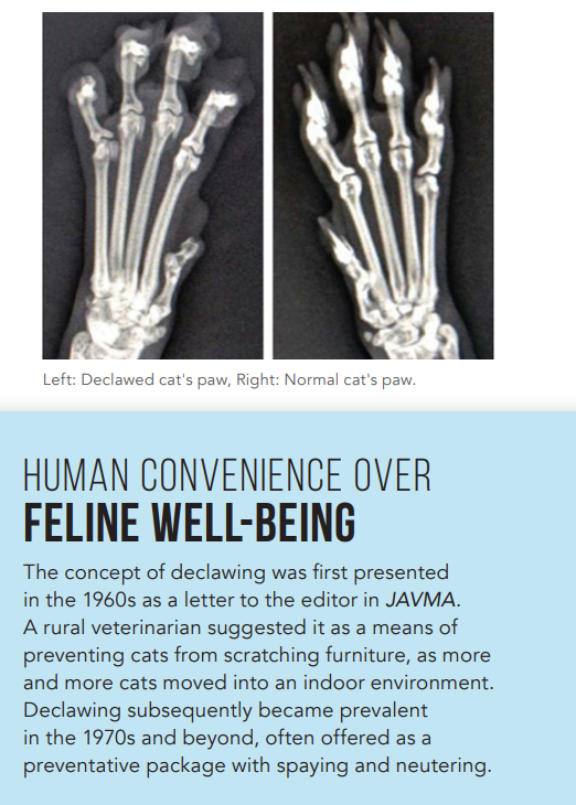 Dr. Nicole Martell-Morin’s peer reviewed study in the Journal of Feline Medicine and Surgery revealed significant increases in back pain, biting, and barbering in declawed cats as opposed to controls. Elimination behaviors and aggression were also more common. In 2001, G. J. Patronek reported in JAVMA that 80% of declawed cats have at least one medical complication post-operatively, and more than a third developed post-surgical behavior problems, including biting and house soiling.