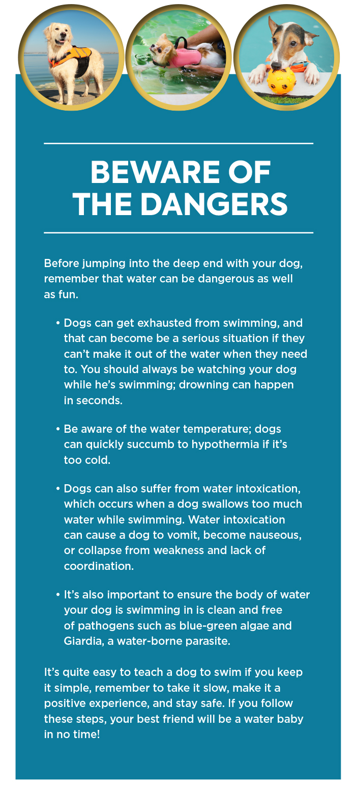 As with any training experience, you want to make sure that teaching your dog to swim is a positive experience for her, so shell have a good feeling about it the next time shes taken to a swimming scenario. Providing lots of praise and encouragement lets her know shes doing something fun and good. Playing with toys and paddling and swimming along with your dog is a great way to reassure her that swimming is a fun time. Once she knows how to swim, she might enjoy participating in other aquatic leisure activities with you, such as paddle boarding, surfing, and kayaking.