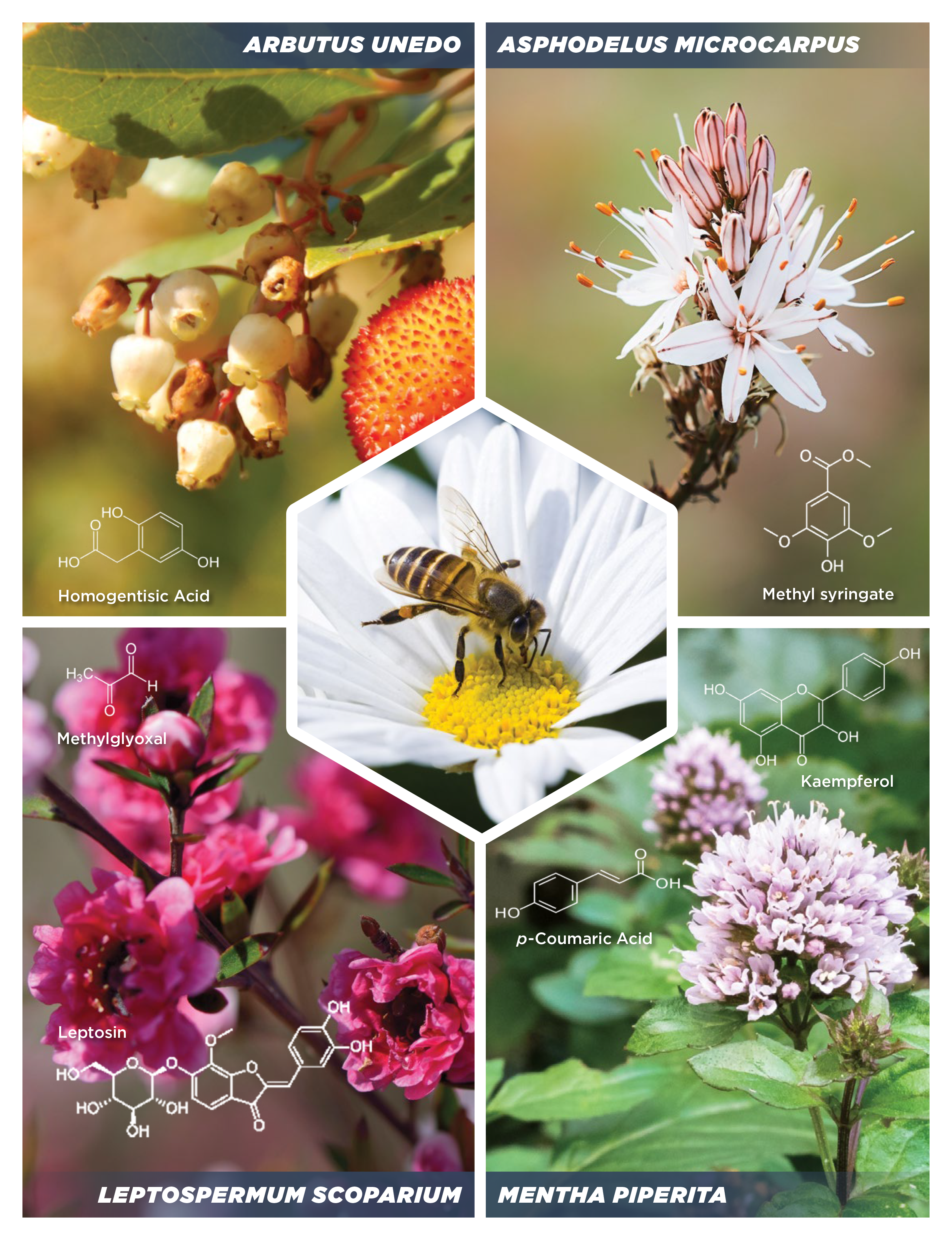 Honey is a complex mixture of over 200 components.10 Monosaccharides, primarily fructose, comprise nearly 80% (w/v), while its water content varies between 15% to 21% (w/v).10 Honey also contains proteins, vitamins, minerals, phenolic compounds, organic acids, and volatile compounds that all contribute to its bioactivity.10 The composition and thus the bioactivity of honey varies based on its geographical origin and floral source (Figure 1).11