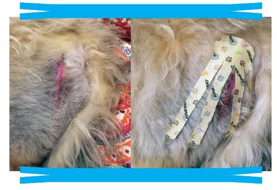 The biggest concern was that the tissue wouldn’t hold the second time because so much was removed. The veterinarian had to hold it together extremely tightly, but the incision did gap open. Thanks to my experience with human patients, I am familiar with the positive effects of therapeutic tape on superficial lymphatic drainage. For years, I’ve seen success in using elastic tape to increase interstitial lymphatic fluid flow and facilitate fluid exchange between tissue layers. So once the staples were removed from Caicos’ wound, I began using canine-specific tape on her, following the standard method for edema control, and to promote healing.