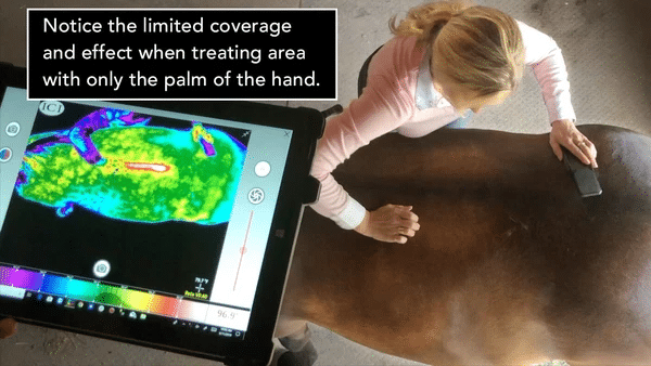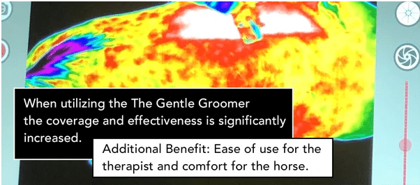 When using a therapeutic grooming tool over target areas, one can effectively stimulate the horses’ muscles and increase circulation to a far greater degree than simply using the hand as seen in the photos below (increased blood flow shown in white).