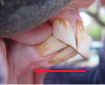 •Look straight at your horse’s incisors. They should be aligned top to bottom. If they are off center or there is a wedge sending them one direction and not the other (below), there’s pathology in the mouth and TMJ.