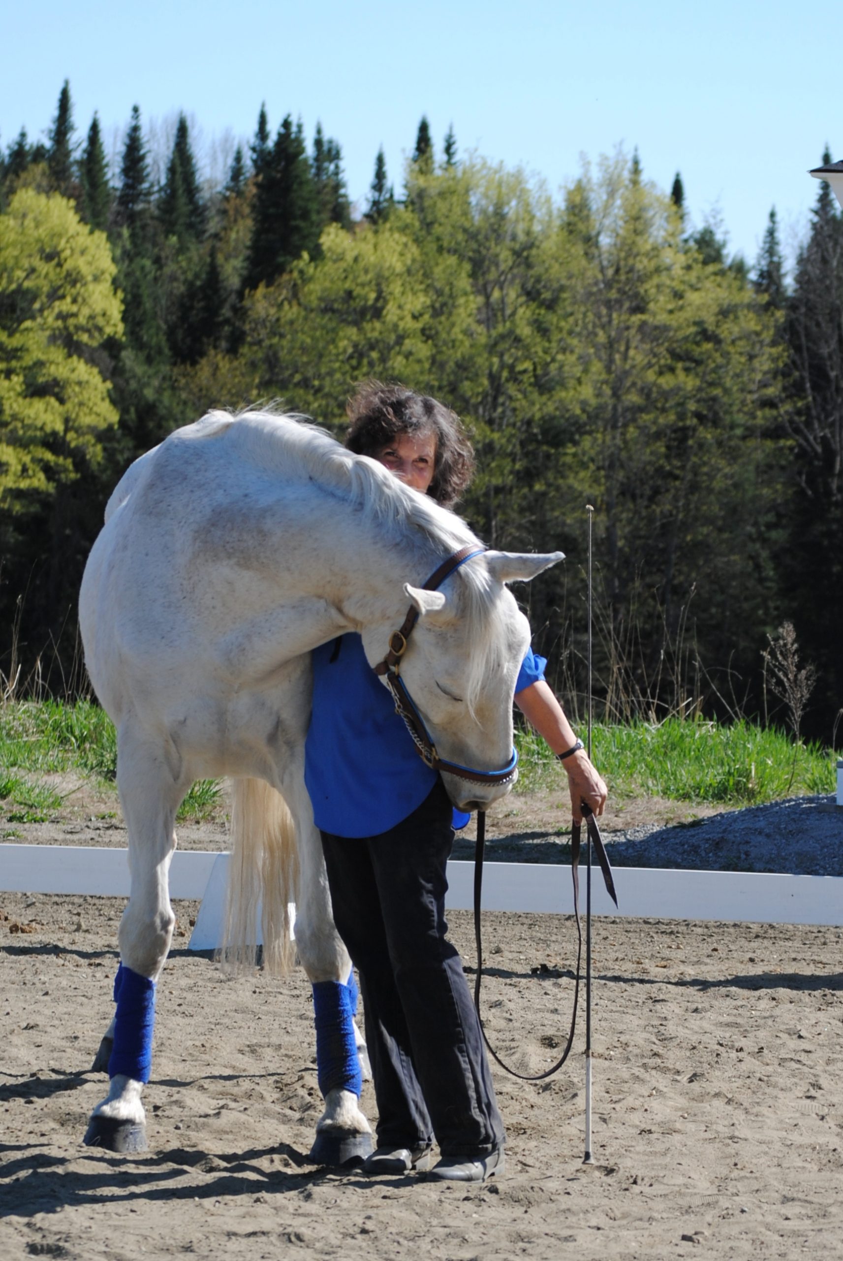 His owner wanted to do something more with him, so she began working on teaching him to “smile” (see image at left). Seeing how much they were both enjoying themselves, I suggested the “hug” and the “curtsy bow”. These tricks stretch the muscles laterally and longitudinally, much like yoga does. The curtsy bow is similar to the “downward dog” stretch. The effort involved in teaching these tricks caused the horse’s owner to spend more time with him. The horse seemed more mentally relaxed when he left his stall, and from practicing his stretches, the wobbly gait he had demonstrated when he first stepped out disappeared.