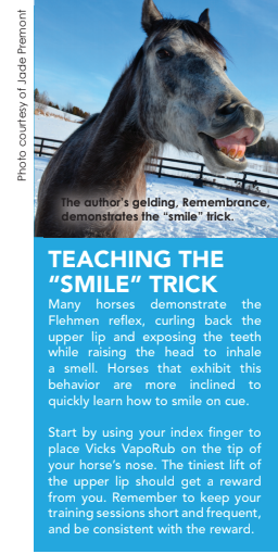 Whatever trick you choose, make it your own unique time together. Emphasize your horse’s strong points and individual personality. Be amazed that you are able to communicate with him on this level. I challenge you not to smile! Even if you don’t, I guarantee you will deepen your connection with your horse.