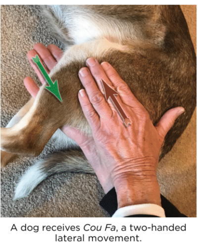 Cou Fa can be applied from the top of a limb down to the paw; from head to shoulder on the neck; or shoulder to tail on the trunk. As needed, repeat this technique three times on your dogs limbs, neck or trunk, to warm and feel the gentle movement of the fascia and muscles beneath.