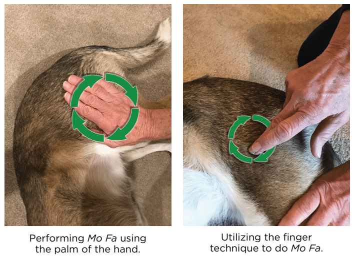 1. Mo Fa (moo fa) involves rubbing in a circular motion. Use the soft pad of your middle finger or the palm of your hand, depending on the size of your dog, and gently move your hand in a circular rotation. Keep your wrists and hands relaxed. Begin slowly with light pressure, then after about ten rotations, increase the speed and pressure until you feel the warmth of the tissues.