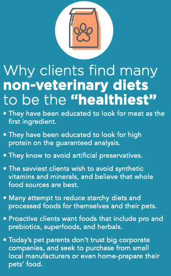 Today’s consumers are purchasing more and more natural options for themselves and their pets, and are questioning old-fashioned conventional recommendations for pet care. Savvy pet parents are seeking veterinarians who know what is trending. They want to believe that their veterinarians are knowledgeable and have their pets’ best interests in mind at all times. Make sure your own advice is in sync with current progressive natural diet expertise. Educated pet parents make better food choices for their pets, and will also respect, trust and appreciate your other integrative suggestions if you are on the same page with them and their move toward quality natural nutrition.
