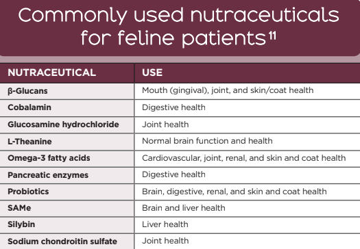 Not only can nutraceuticals be organized into the above four categories, but they can also be subcategorized into the body systems they support. Nutraceuticals are known to help the brain, digestive system, mouth and gums, cardiovascular system, immune system, musculoskeletal system, hepatic system, renal system, and of course the skin and coat.11 Of these, most veterinarians are familiar with nutraceuticals for skin, joint, and digestive health.2,11 Omega -3 fatty acids, glucosamine and chondroitin, SAMe, silybin, and probiotics are some of the most commonly prescribed nutraceuticals.2 The table on page xx outlines some of the more common nutraceuticals used in feline patients.