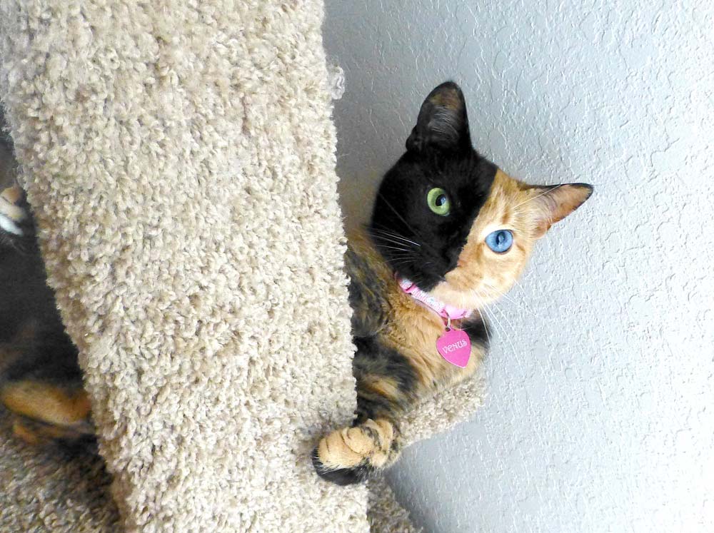 Venus started her life as a stray, born six years ago on a dairy farm in North Carolina to a tortoiseshell mother – the identity and coloration of the father is unknown. “I first saw pictures of her, along with her siblings, on a friend’s Facebook page; the friend casually posted the photos as just some cute kittens on a farm. When I noticed her two different-colored eyes. I knew she was something very unique and special.” Although Christina and her family live in Florida, she called her friend and made arrangements to adopt the kitten after a vet check. A few days later, her husband flew up to North Carolina to get the kitten.
