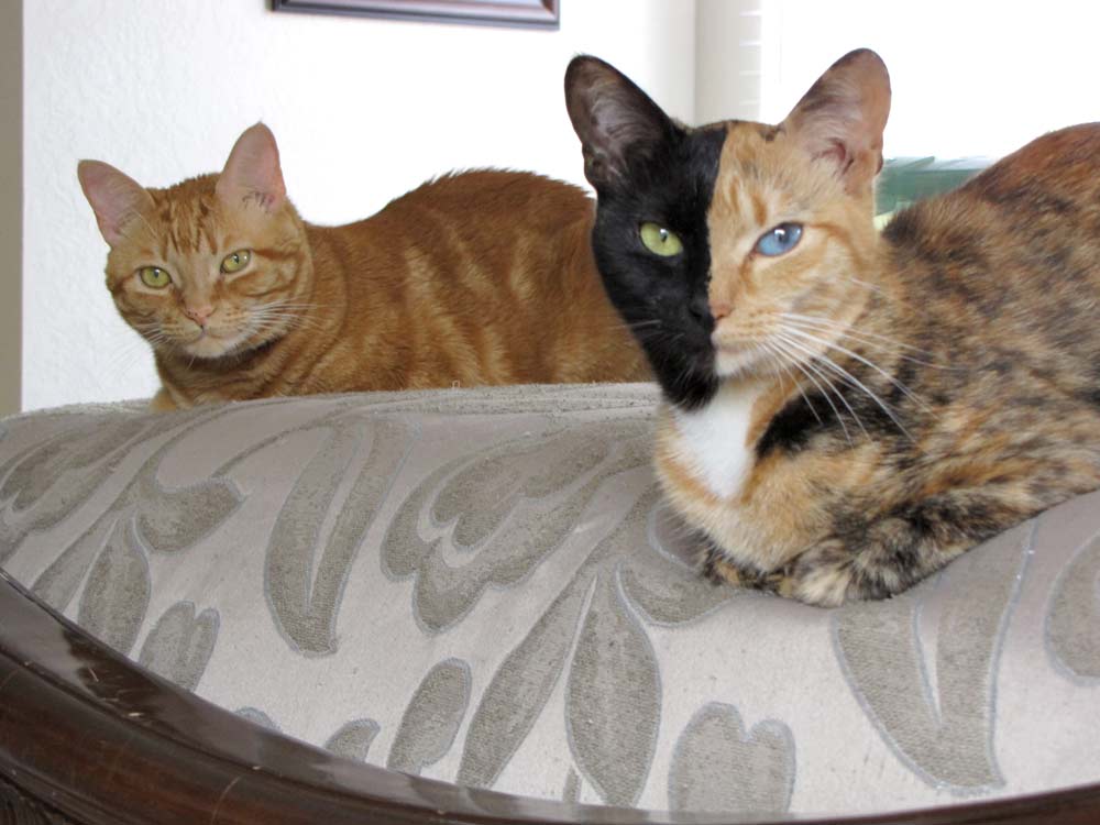 “There are several theories behind her appearance,” says her person, Christina. “She could be what is referred to as a ‘chimera’, which would mean she absorbed the DNA of a fraternal twin zygote that didn’t survive.” Another explanation is that her coloring is just a very unique example of X-inactivation, a phenomenon found in tortoiseshell and calico cats. The black and orange alleles (alternative forms of the same gene) of a fur coloration gene reside on the X chromosome; for any given patch of fur, the inactivation of an X chromosome that carries one gene results in the fur color of the other, active gene. Either way, her unique looks have resulted in articles in both National Geographic and Smithsonian Magazine.