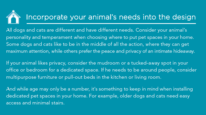 From learning a new trick to passing an obedience class, dogs and cats are celebrated for much more than just their birthdays nowadays. In a survey conducted last year, homebuilding company Ashton Woods found that more than 70% of future homebuyers are interested in incorporating dedicated pet spaces into their homes. This trend transcends multiple generations as Millennials, Gen X and Baby Boomers alike say they are looking for ways to integrate their companion animals’ needs and preferences into the comfort and luxury of their homes. Here are five ideas for creating special spaces in your own home for your canine or feline companion.