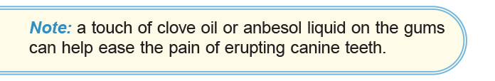 Erupting canine teeth in male horses (between four and six years of age) are another source of discomfort as the sharp tip of the tooth pushes on the gums for weeks before it erupts. Watch for these bumps between the incisors and molar arcades and be gentle putting the bit in and out to lessen his discomfort during this process.