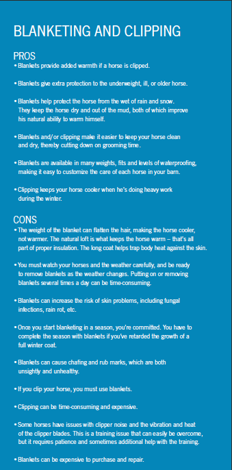 If your horse lives in a more natural manner, you have a better chance of being able to avoid blanketing. Regardless of whether you clip, blanket, or let your horse go “au natural,” you must still provide adequate shelter from wind and rain/snow.