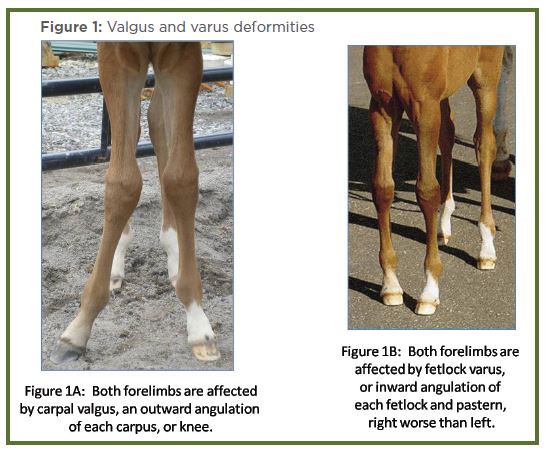 Foals can be born with an angular deformity, or one can develop as the foal grows. One or both legs may be affected, and to differing degrees. The leg can angle outward, known as a valgus deformity; or inward, known as a varus deformity (Figure 1). The prognosis depends on the severity of the deformity, what joint is involved, the underlying cause, and the age of the foal at the time of veterinary examination.